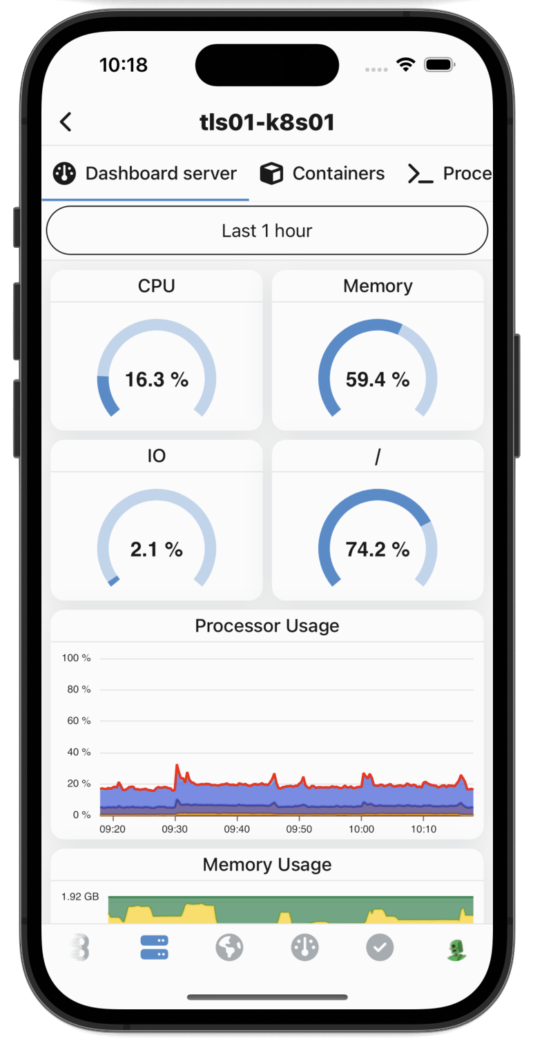 For more intuitiveness you can slide between your dashboards with all server key metrics (CPU, RAM, Disk, network), Docker containers view (with statistics and docker information), live processes monitoring, and information.