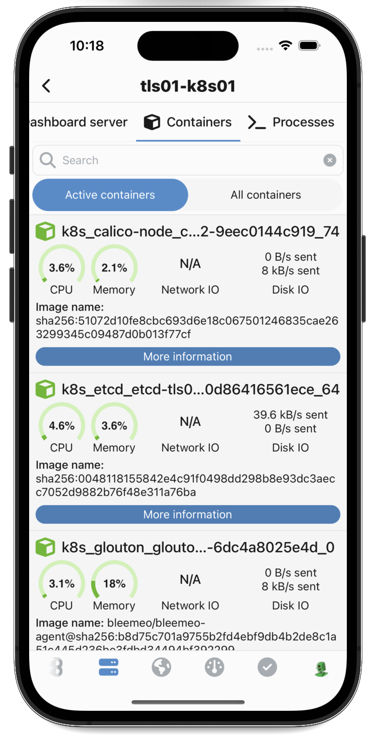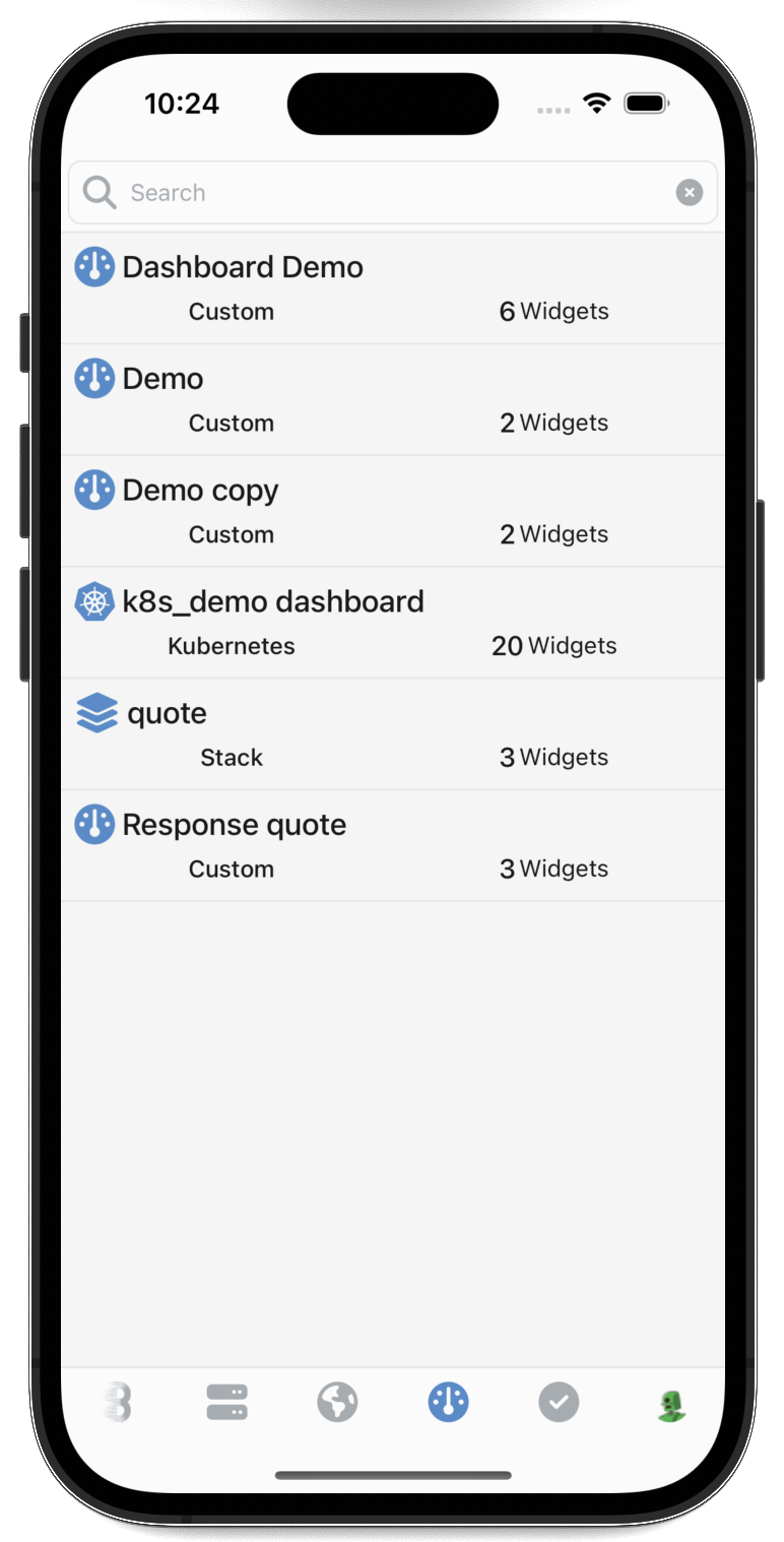 The Dashboards section contains all the custom dashboards you have created from the Bleemeo panel or any Dashboard you could have created using labels/annotations on your containers and/or tags on the machine. This allows you to get on your mobile all the business information related to your infrastructure. With all those tabs combined, you can get a complete view of your server’s health wherever you are.