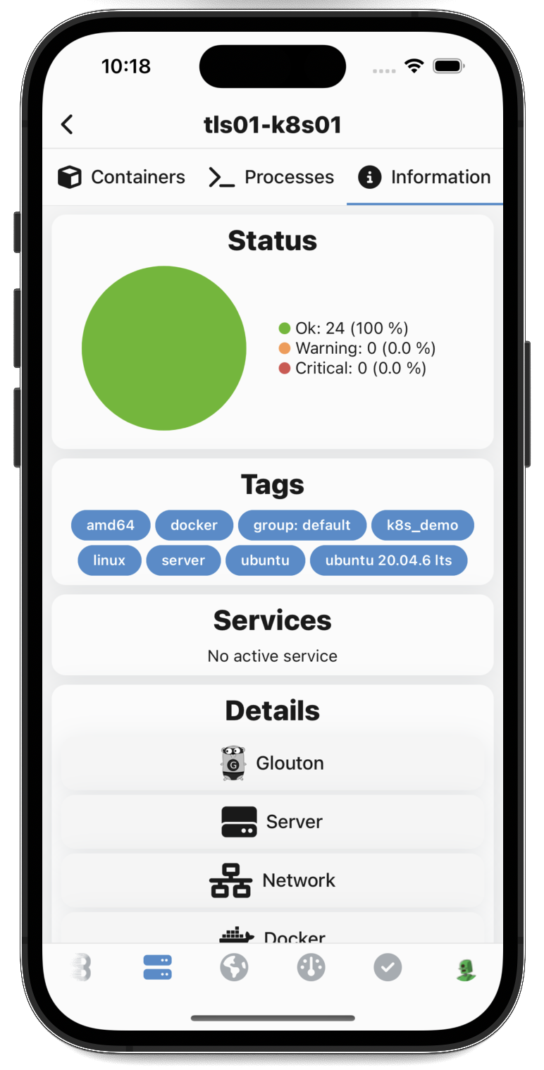 The first section allows seeing each server of your infrastructure, the server default dashboard, all containers, and a live process view of what’s running on the server. If you get alerted on the server, you can check all health details on this server within this section.