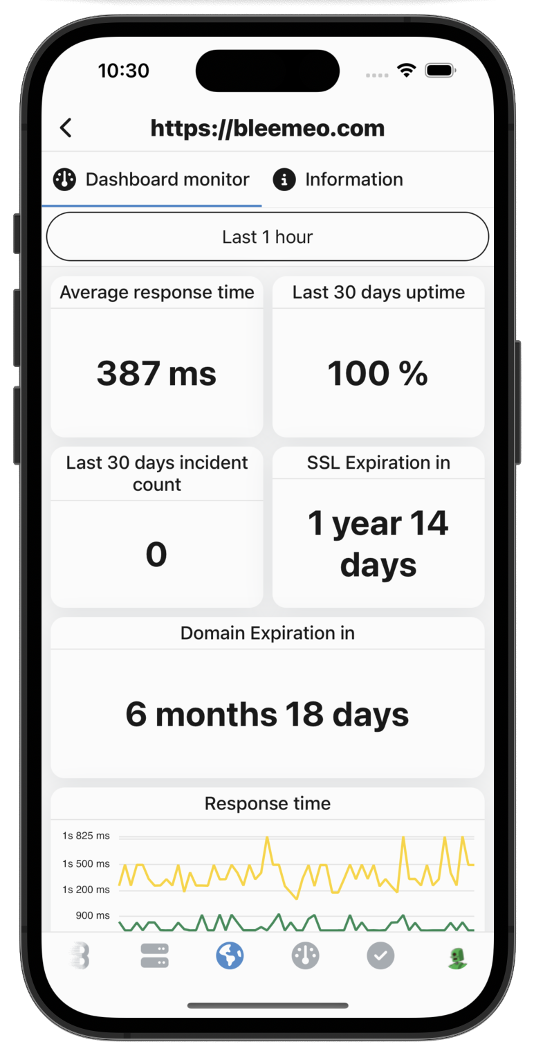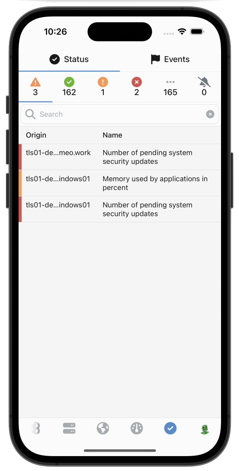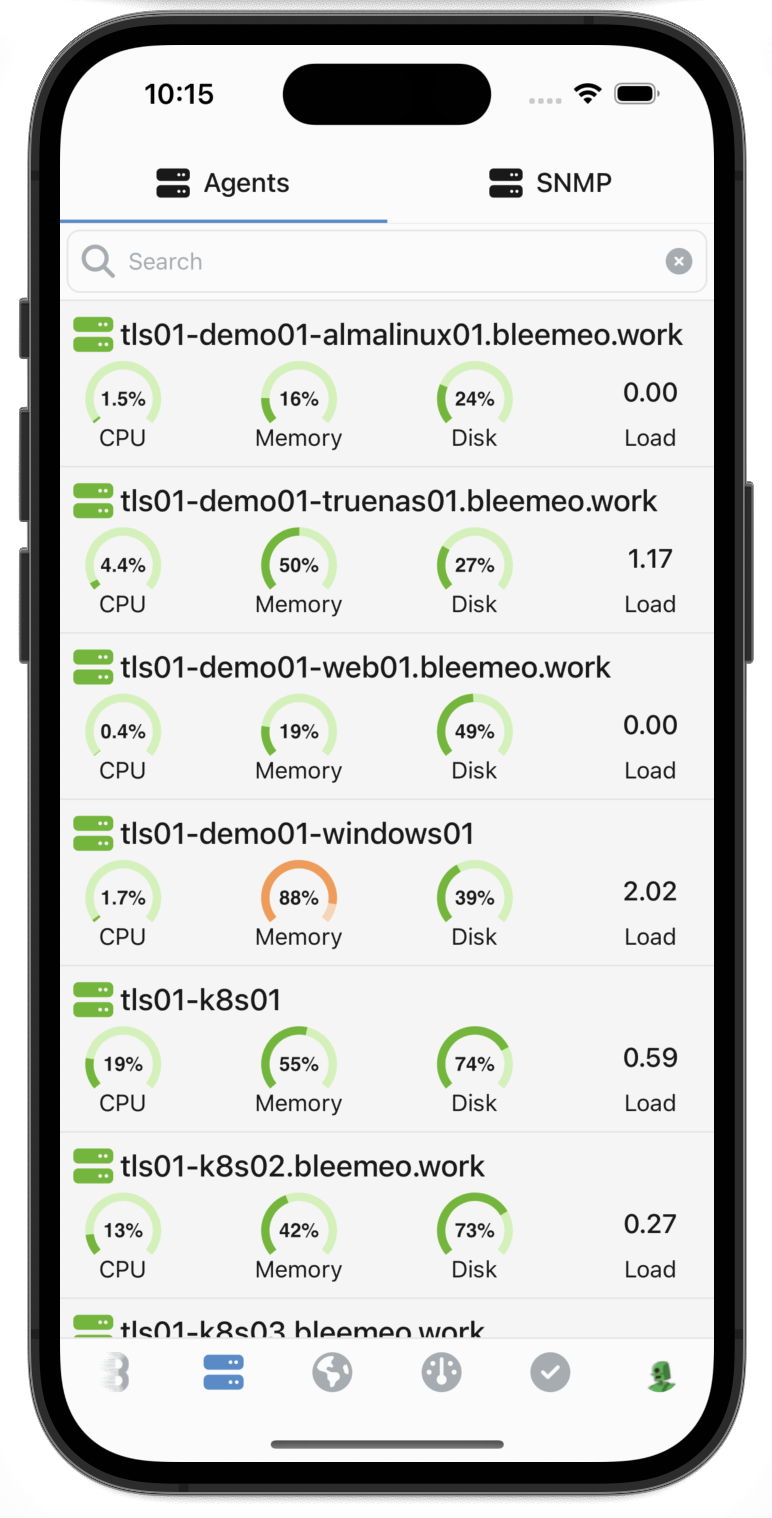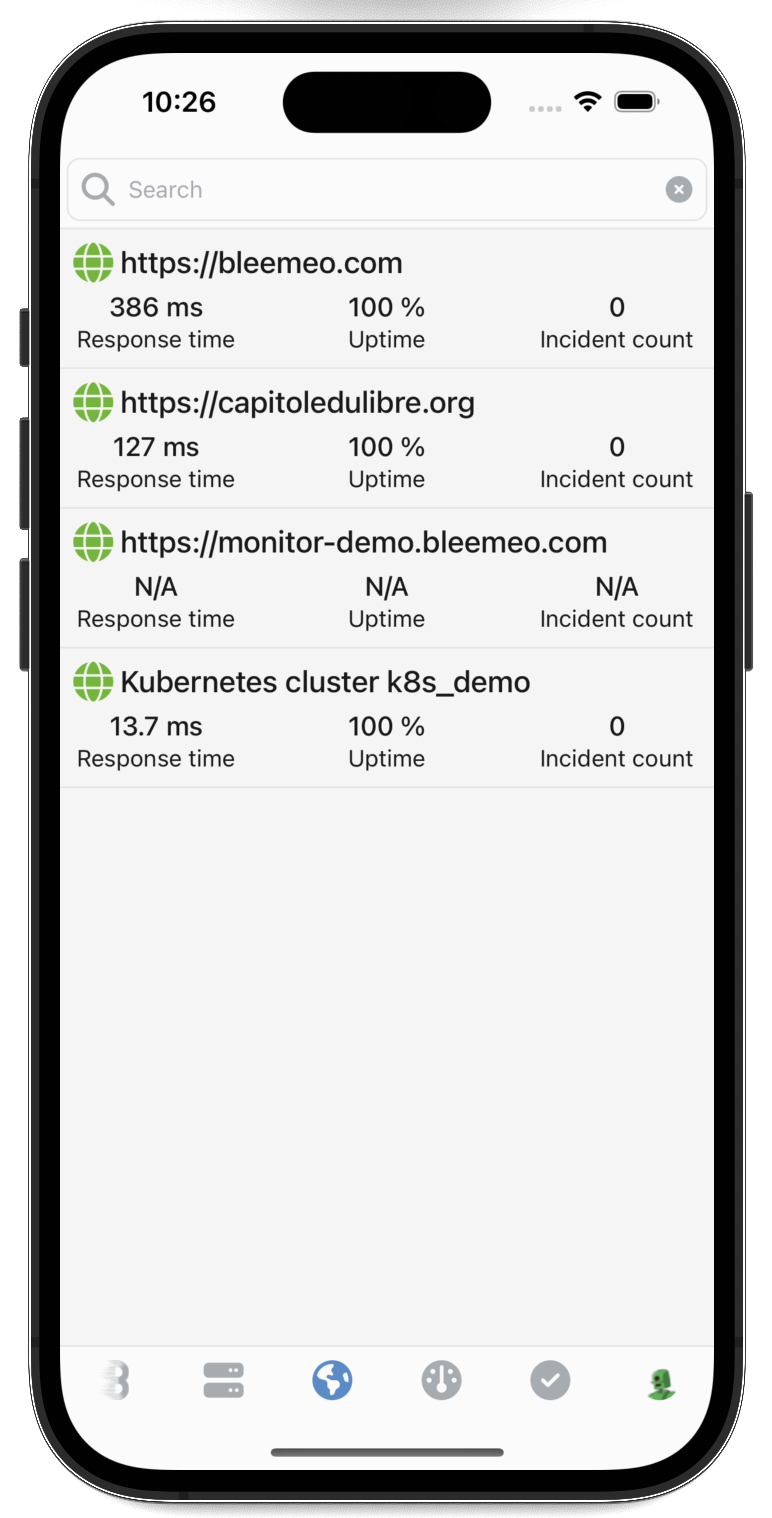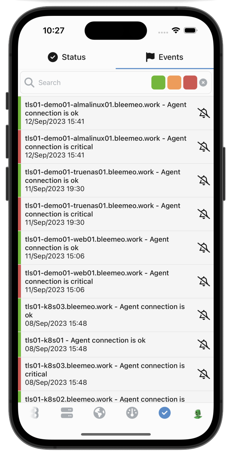Bleemeo offers a Mobile application to track your infrastructure from everywhere. All views you have on the Cloud Interface are also available from the mobile application. To configure something you need to access the Cloud Interface. The mobile application also delivers notifications.